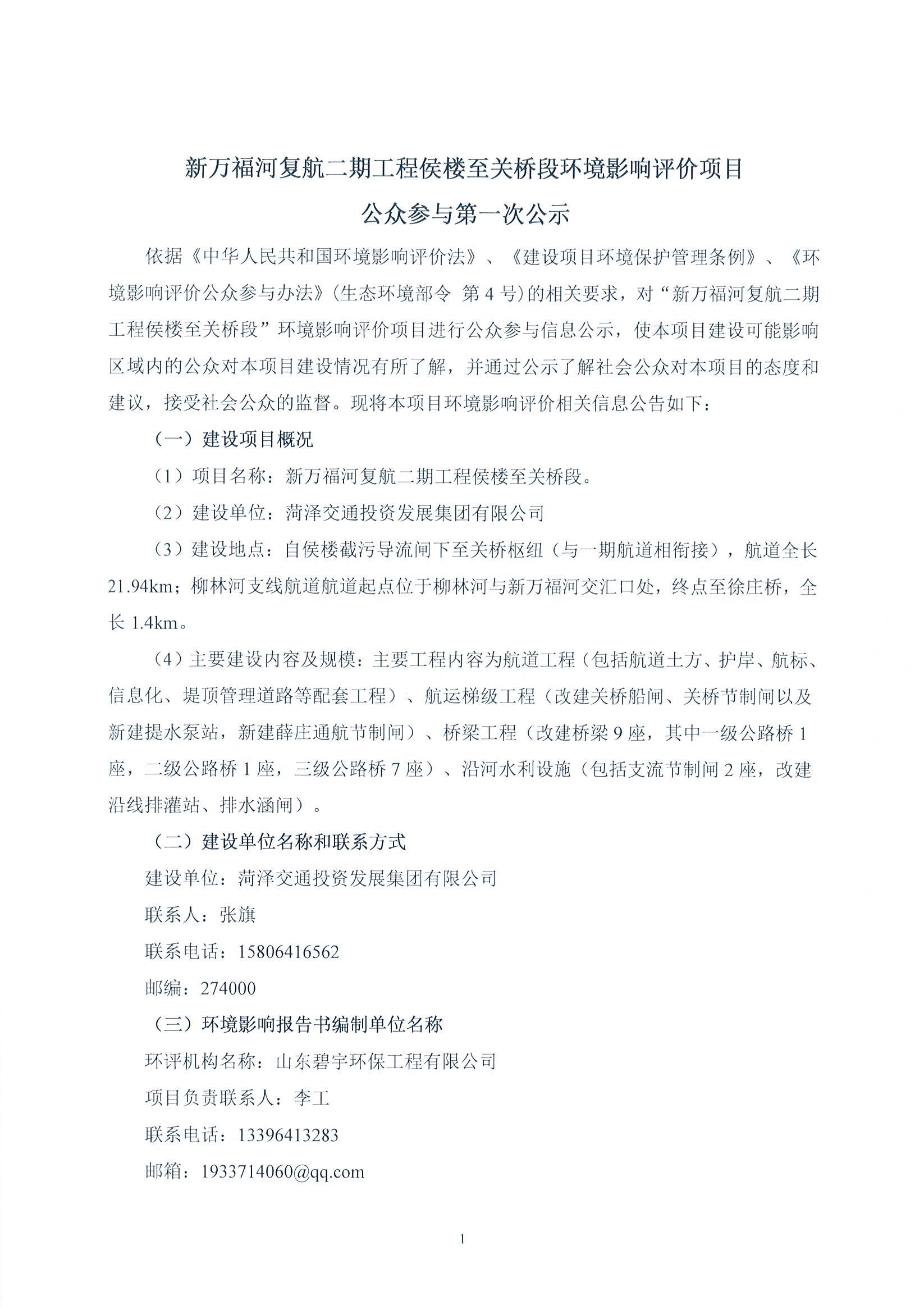 新萬福河復航二期工程侯樓至關橋段環境影響評價項目公眾參與第一次公示